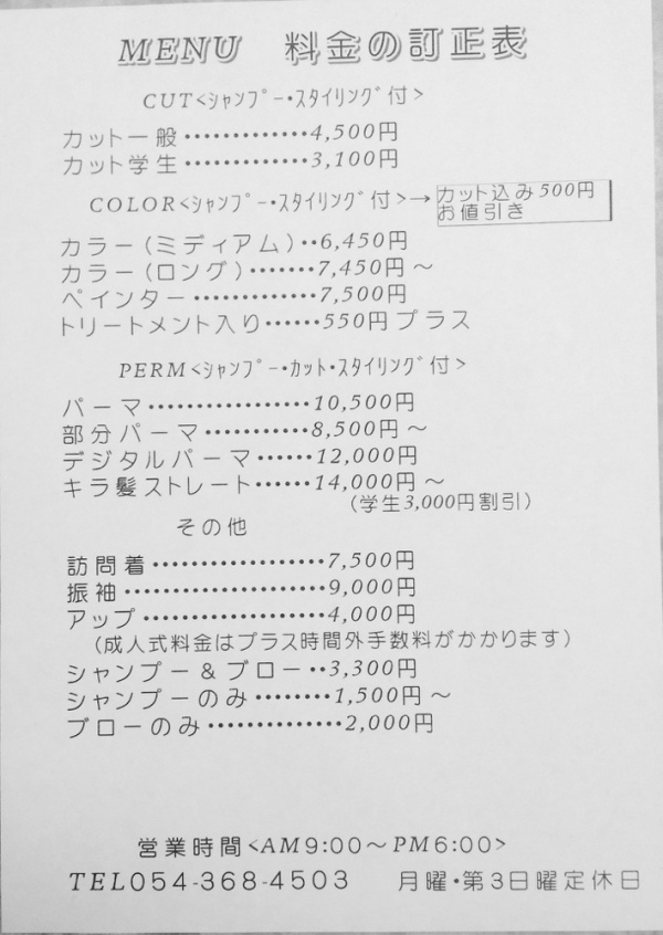 光熱費・材料費等の物価高騰を受け、当店も12月より一部メニューの料金を引き上げさせて頂きます事を御了承下さい。